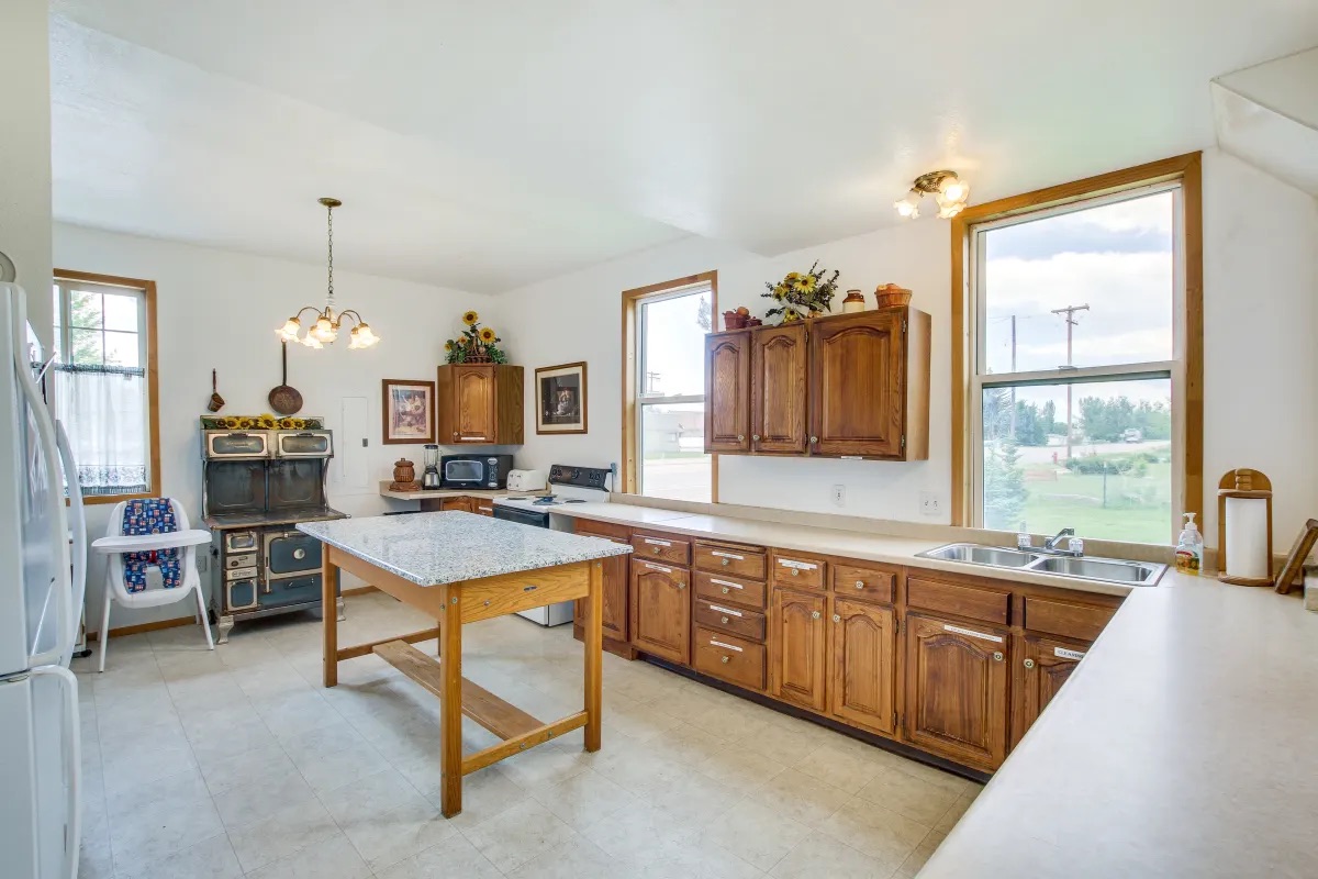 - The kitchen has three refrigerators, an oven, stove, microwave, pots and pans, 4 pancake griddles, blender, toaster, 2 cookie sheets, slow cooker, silverware, kitchen utensils, large bowls, trays, tablecloths, dish cloths, dish soap, and a large island with plenty of counter space. There is no dishwasher. Bring your own paper plates, cups, and napkins.