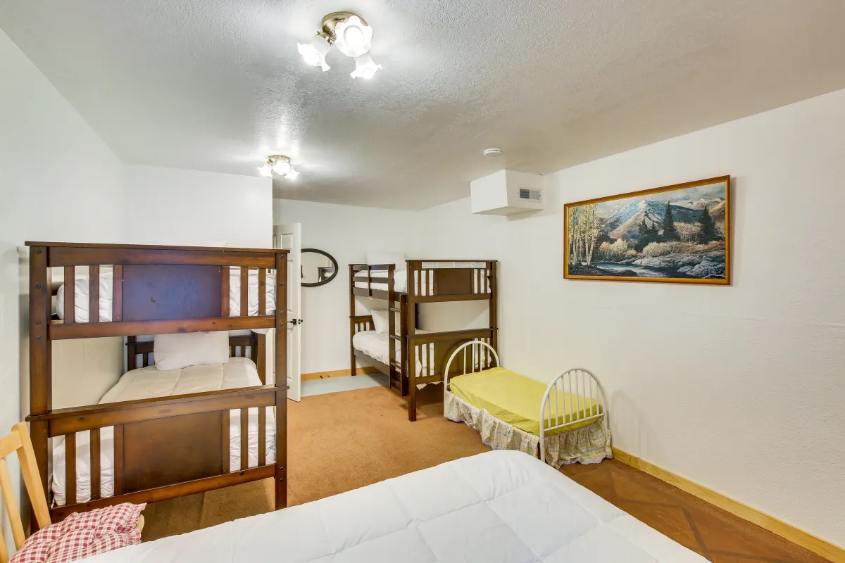 - Aspen Grove: 1 queen bed, 2 bunk beds, 1 toddler bed